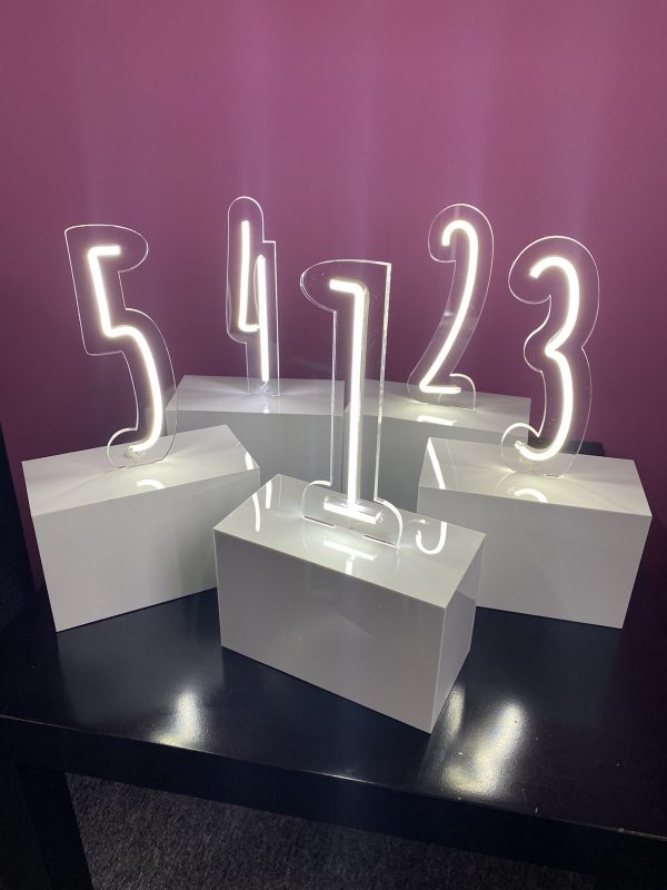 Номерки на стол из неона – это необходимый атрибут любого ресторана, ведь очень важно, чтобы гости с легкостью нашли свои посадочные места. Наши пластиковые и акриловые номерки на стол помогут им в этом! Но мы не ограничиваем Вас только пластиком и акрилом, это может быть также фанера, ламинированная плита, а также другие материалы.